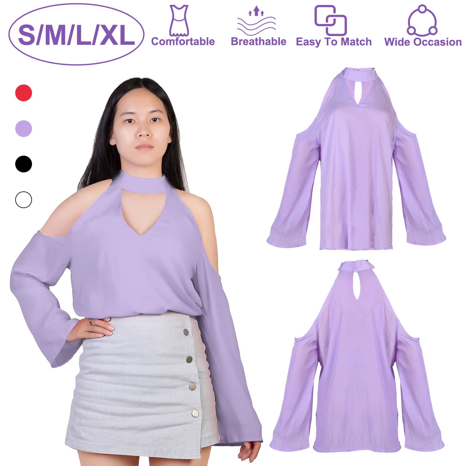 Home > Women\'s Sexy Off The Shoulder Blouses Cold Shoulder Tops V-Neck Long Sleeve T-Shirt Solid Color Summer