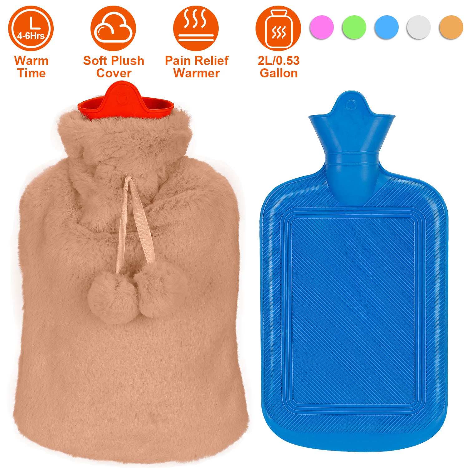 2L Hot Water Bottle w/ Plush Cover Classic Natural Rubber Hot Water Bag Feet Warmer¯r Pain Relief Hot Compress Heat Therapy Warm Neck Shoulders