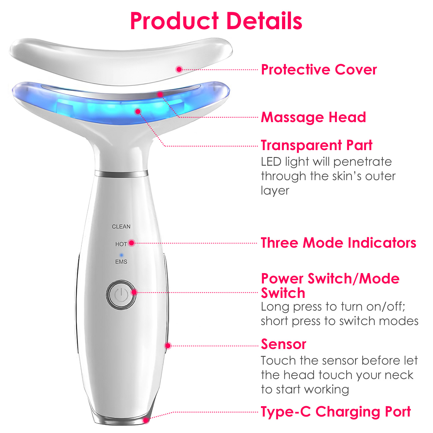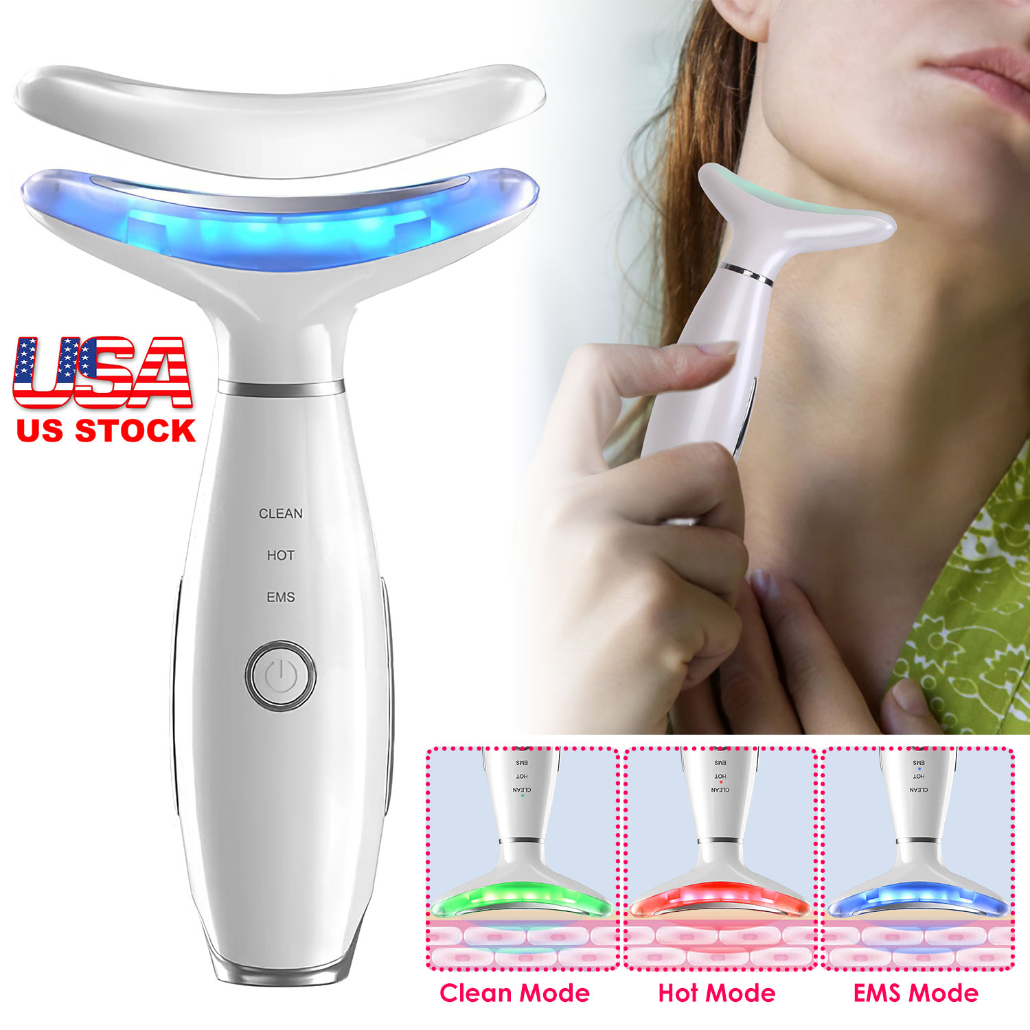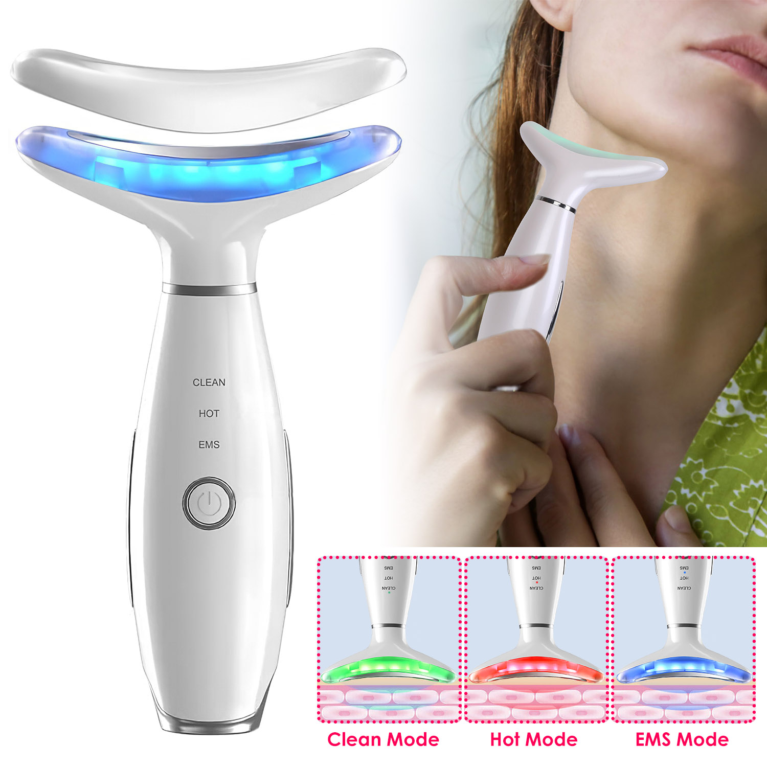 Mode: Clean(Green Light, Vibration), Hot(Red Light, Vibration, Hot Feeling Max 42?/107.6?), EMS(Blue Light, Vibration, EMS)