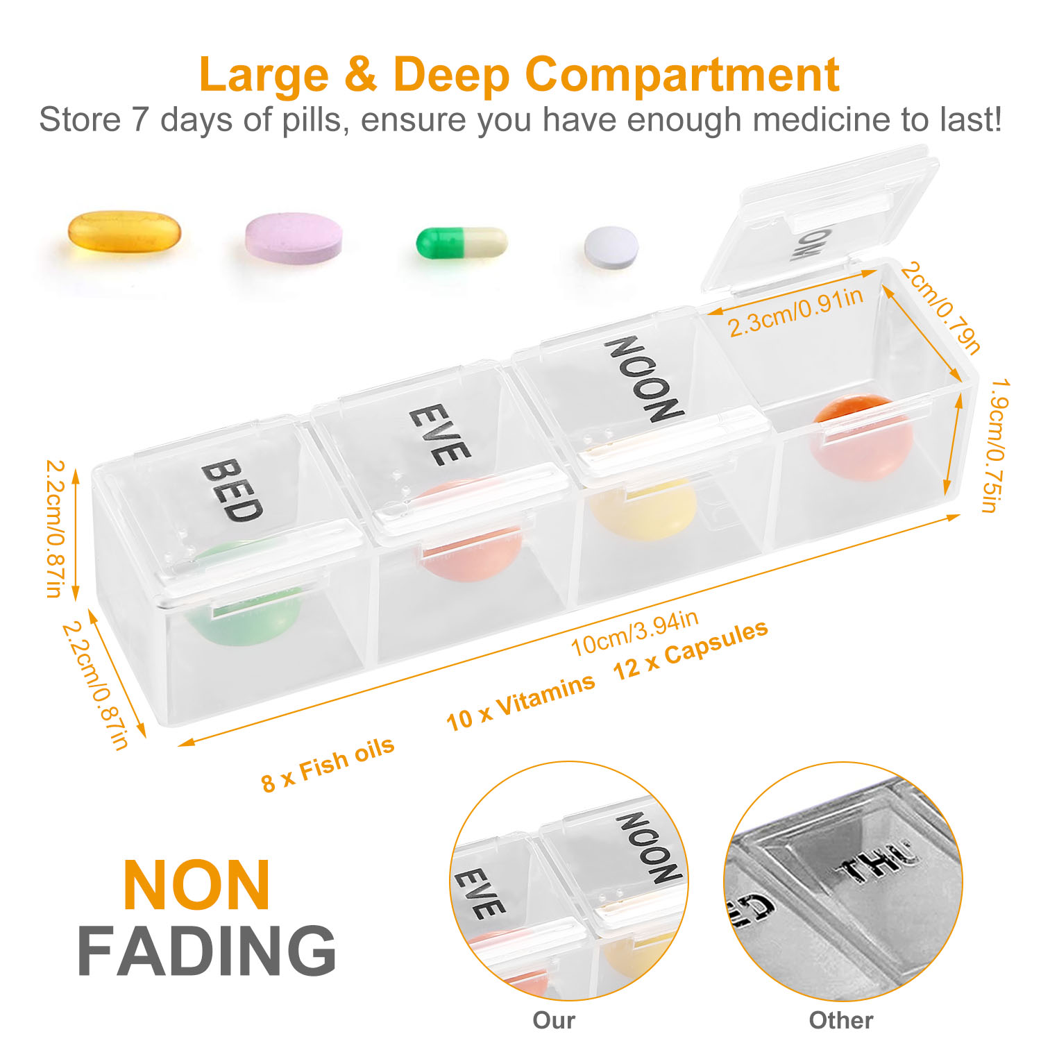 Pill Organizer Size: 10x2.2x2.2cm/3.94x0.87x0.87in (L×È)