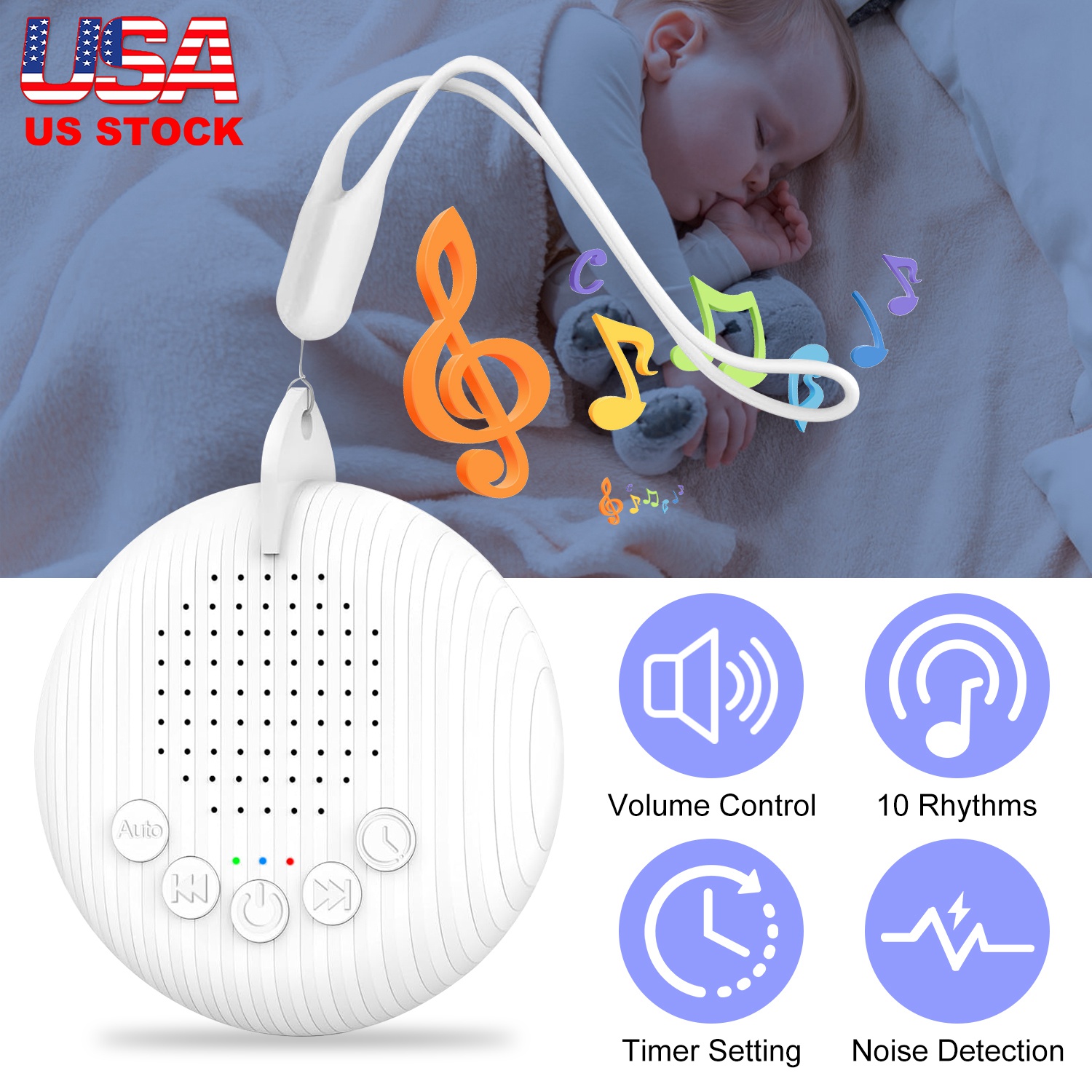 White Noise Rhythm: White Noise/Lullaby 1/Crickets/Sea Waves/ Clock/Birds/Heartbeat/Lullaby 2/Streams Sound/Lullaby 3
