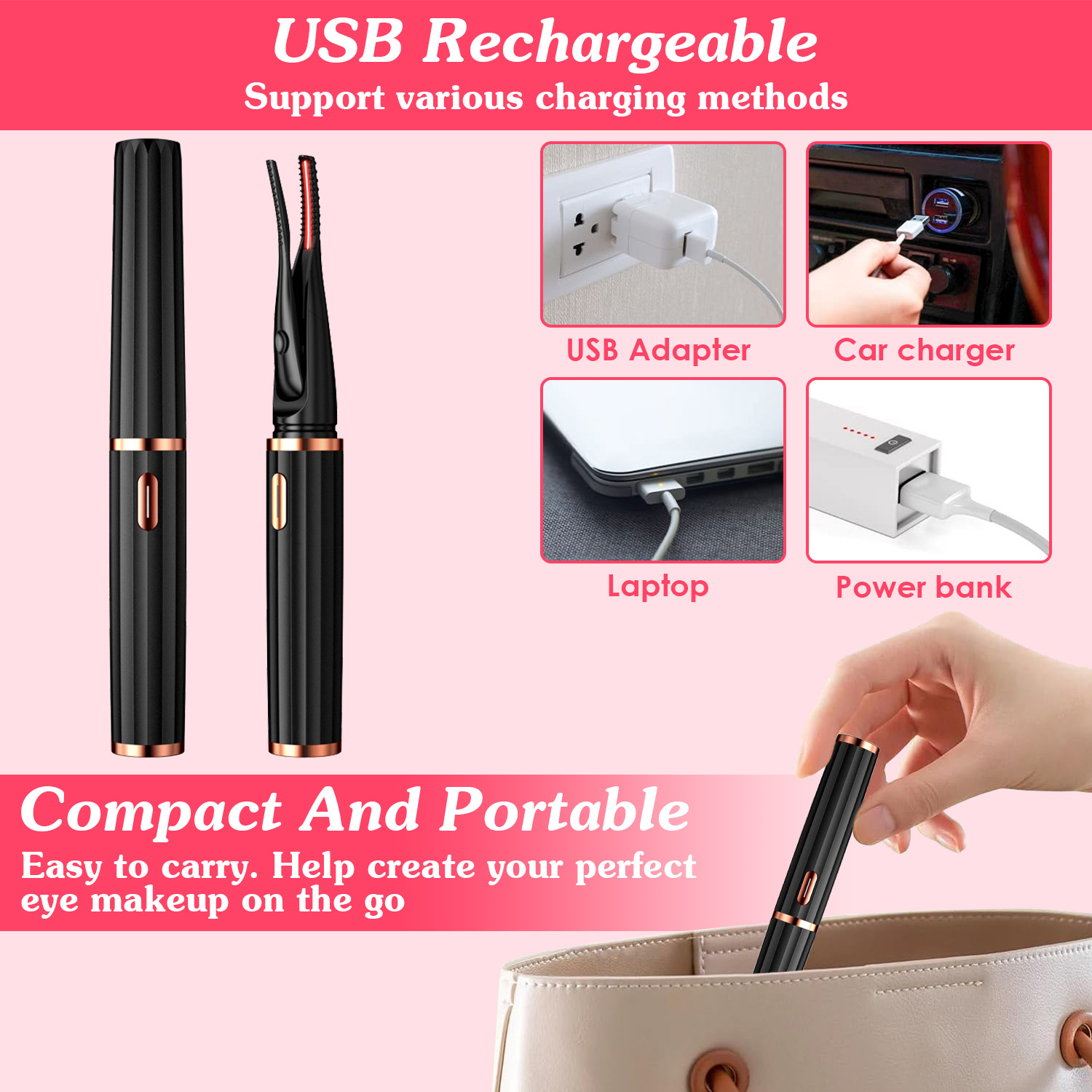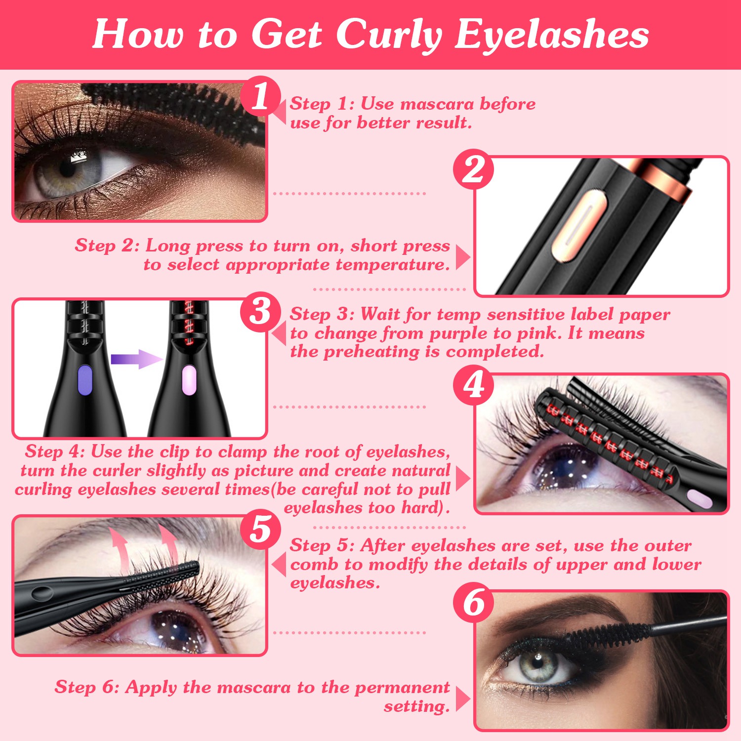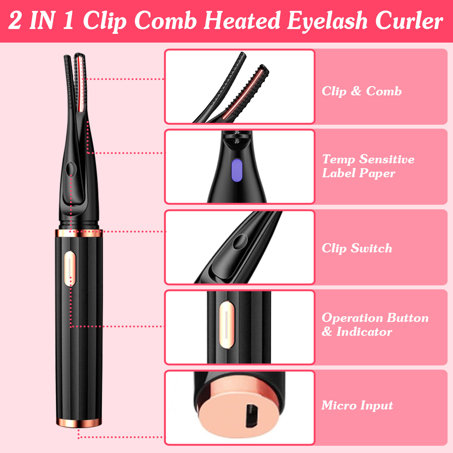 Home > 2 In 1 Clip Comb Heated Eyelash Curler Electric Mini Lash Curler Natural Eye Lash Makeup Tool with 3 Temp Settings 15Mins Shutdown